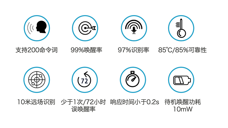 探境語音方案可支持200條命令詞,擁有高達99%的喚醒率和97%的識別率,誤喚醒率少于1次/72小時,響應時間小于0.2s,可做到10米遠場識別距離,具有精準的識別效果。